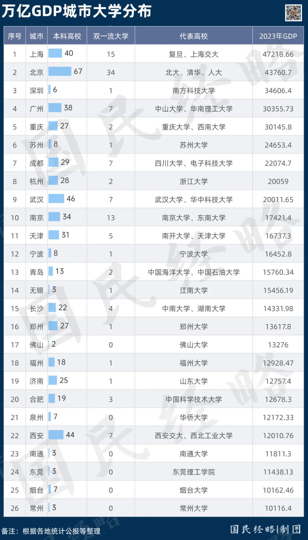从在校大学生数量和双一流大学分布来看,位居前列的几乎都是省会和直辖市,经济强市则是全面垫底。