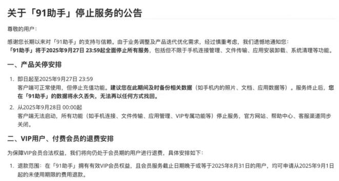 上月底,91 发了个公告,说要在 9 月 27 日全面停止服务,所有数据会永久丢失,那些没到期的 VIP 会员记得登记一下退款啊。
