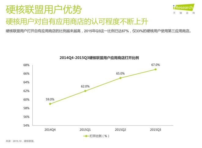 2015 年第三季度,硬核联盟用户打开官方 App 商店比例就上升到了 67%。5 年后,联盟应用商店渗透率更是达到 64.38%,为所有分发平台中最高。