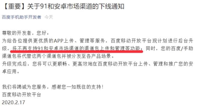 比如早在 2020 年,91 助手和它的兄弟安卓市场就停止应用商店的分发业务,关闭了渠道包的上传和管理。