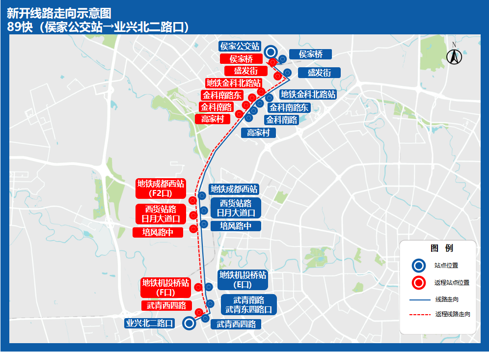 站点设置:侯家公交站、侯家桥、盛发街、地铁金科北路站、金科南路东、金科南路、高家村、黄金路北、黄金路中、地铁成都西站(F2口)、地铁成都西站(返程)、西货站路日月大道口、培风路中、地铁机投桥站(F口)、地铁机投桥站(E口)(返程)、武青西四路、武青南路武青东四路口(返程)、业兴北二路口(返程)。