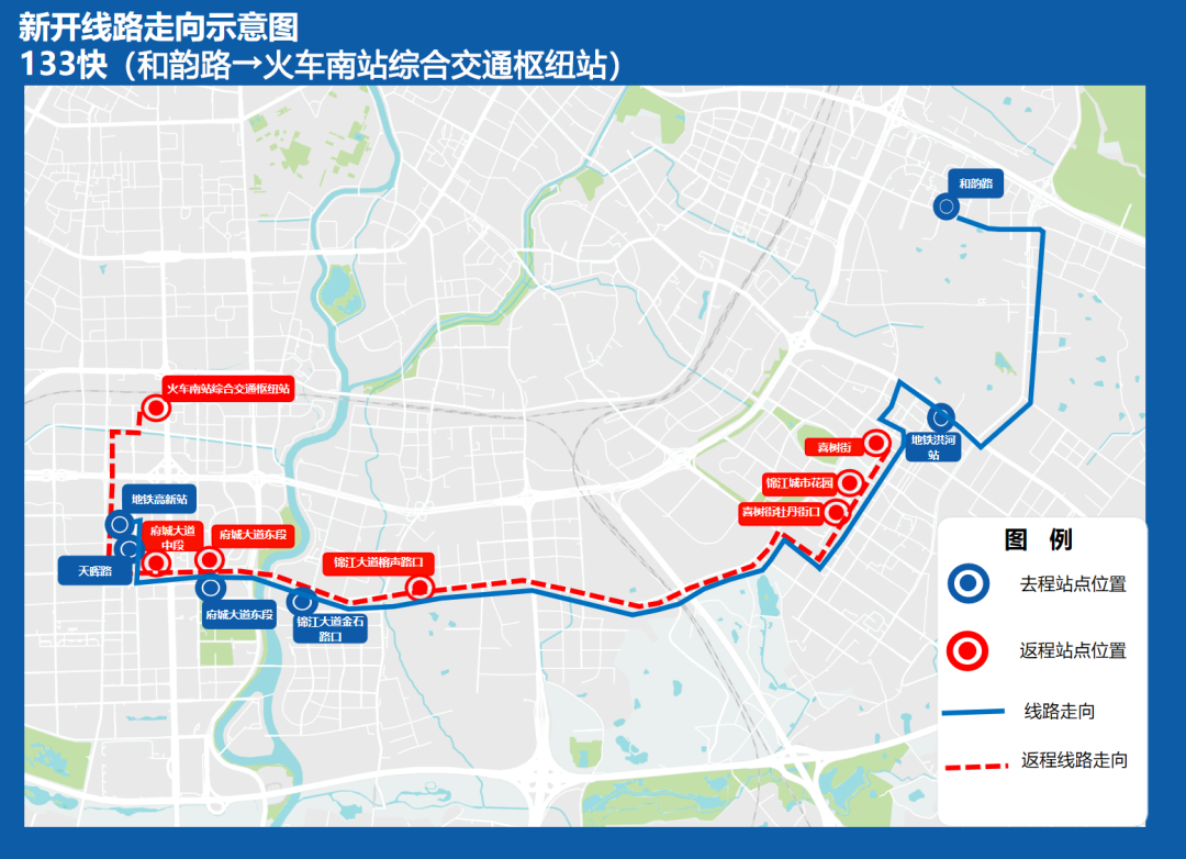 “133快 ”站点设置集中在高新南区办公热力区、锦江区工业园、喜树街及洪河大道沿线大型住宅小区,相较于原线减少了18个停靠站,单程运行时间减少15分钟左右。大幅度的“减站”让锦江城市花园等小区市民乘客可以更快速地前往地铁洪河站、火车南站、金融城片区。
