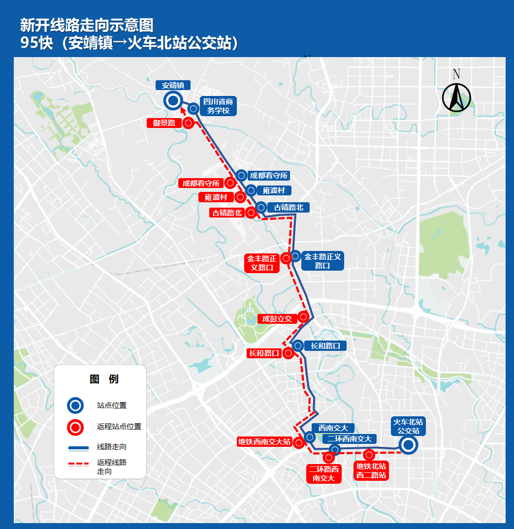 “95快”则在95路走向和站点的基础上,只停靠安靖镇、四川省商务学校、雍渡村、西南交大、火车北站公交站等10个站点,相较于原线减少了12个停靠站,单程运行时间减少10分钟。同时,线路接驳BRT二环西南交大站,地铁5号线、6号线、7号线等换乘站点,为安靖片区及金丰路沿线市民乘客地铁换乘、上下班通勤等提供快速接驳服务。
