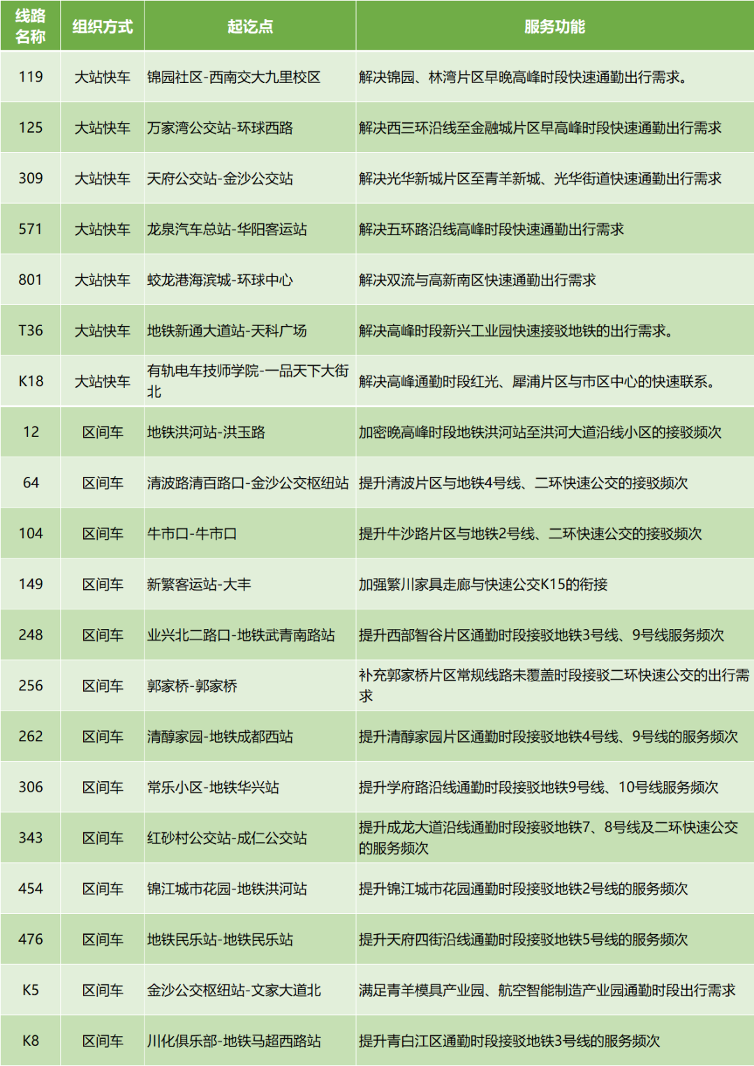 大站快线是成都公交通过创新营运方式,依托常规线路途经道路及停靠站点,“定时定点”在原线路基础上通过减少站点停靠数量、提高行驶速度的方式,提升乘客通勤效率。