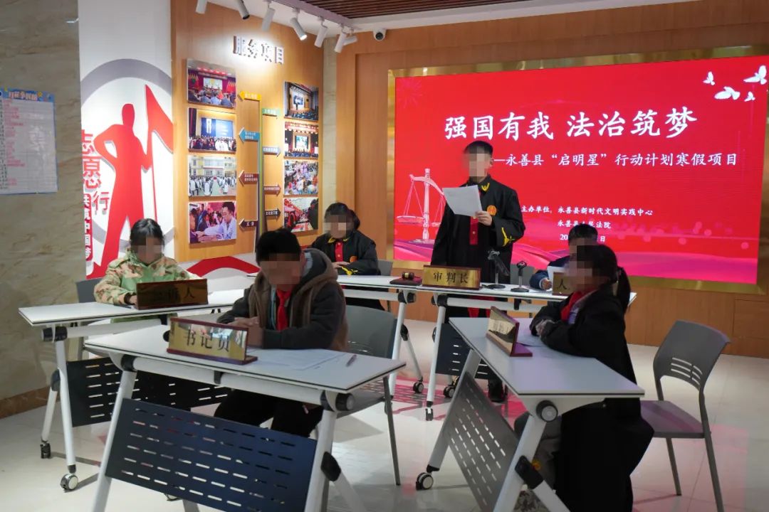 为深入推进未成年人普法宣传,筑牢未成年人司法保护屏障。2月1日,永善法院到永善县新时代文明实践中心举办了“强国有我 法治筑梦”——永善县“启明星”行动计划寒假项目,永善法院刑事、民事、行政审判庭联合普法,采取法制讲座、法器认识、模拟法庭方式为小学员们送上寒假里的法治大餐。
