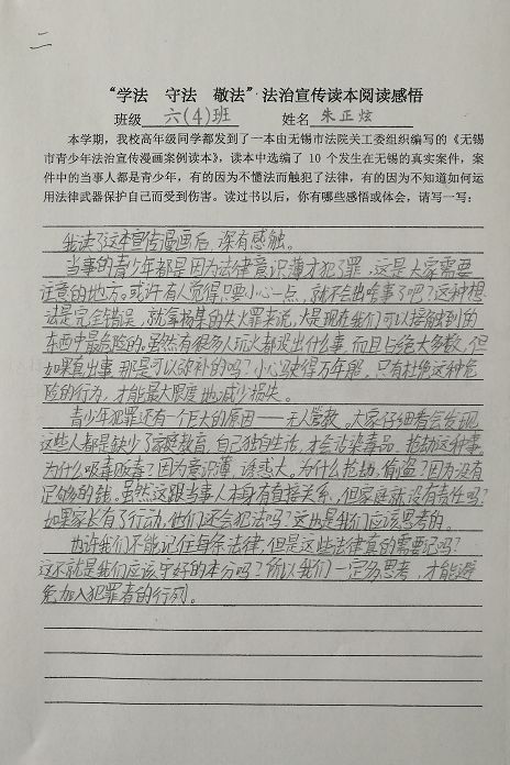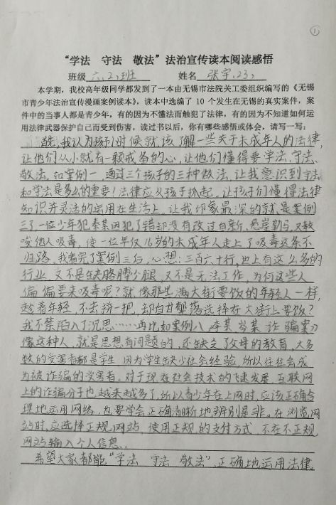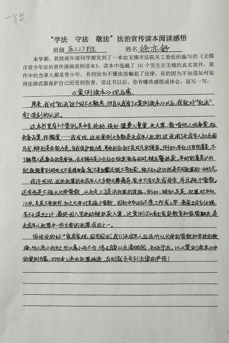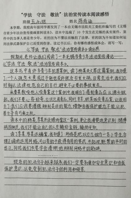 2018年11月市中级人民法院关工委向法治宣传挂钩联系单位——五河新村小学五六年级学生赠送了由全市法院参与编写的《无锡市青少年法治宣传漫画案例读本》(以下简称案例读本),并与学校联合举办“学法守法敬法”青少年法治宣传征文比赛活动,组织学生利用业余时间撰写阅读感悟。该校统一印制了《“学法守法敬法”法治宣传读本阅读感悟》格式,计350余名学生参加了这次征文比赛活动。学生们围绕案例读本10起典型案件,在认真阅读的基础上,分别对感触最深的案件,紧密联系自身、家庭和学校等实际,写下了真切的感悟和体会。这项活动不仅丰富了法治宣传教育内容与形式,而且对学生也产生了较强的震撼力与感染力,对于学生们增强“学法守法敬法”的法治观念,养成崇尚道德、遵纪守法的行为操守将起到引导作用。现摘选部分获奖学生撰写的心得体会予以公布。所选征文除对错别字、不准确的标点符号或用词进行修改外,均为原文。