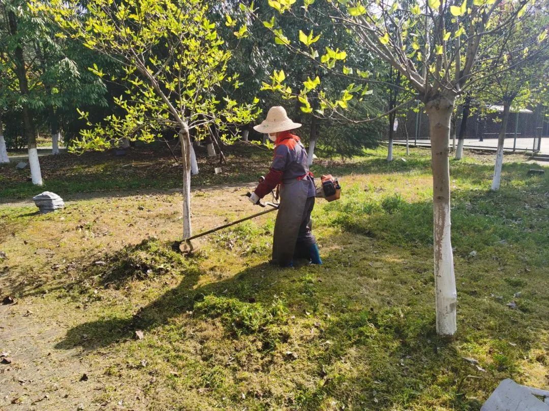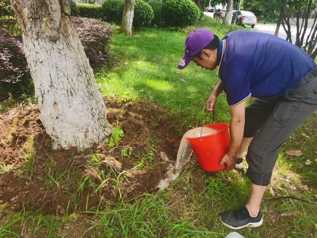 这样的景观离不开绿化养护工作人员的付出。后勤部门根据气候条件、季节等因素开展养护工作,根据植物生长状态,适时进行日常浇水、除杂、修剪、树干加固支撑、喷药、病虫害防治、古树名木养护等工作。在花朵盛放的春天里,他们注重病虫害的防治工作,对植物有一些特别的养护措施,如在开花前进行一次施肥,提供养分,使其根系旺盛以保花促花,这才有了南大校园春风拂过、一路生花的景象。