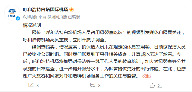 经调查核实,情况属实,该保洁人员未在规定的休息室用餐。目前该保洁人员已被物业公司辞退。同时机场联系到了事件相关旅客,并真诚地表达了歉意。今后,呼和浩特机场将加强对保洁等一线工作人员的教育培训,加大对母婴室等公共设施的日常巡查,进一步提升服务水平,为旅客提供更好的出行体验。在此,也感谢广大旅客和网友对呼和浩特机场服务工作的关注与监督。