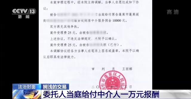 山东省烟台市蓬莱区人民法院法官 王丽娜:张女士接受不了,她认为之后一些具体交易的操作,中介公司没有参与,也不想给那么多的中介费,然后她提出给一万块钱。