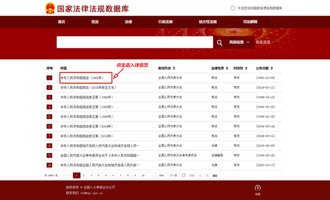 点击“首页”,在“宪法、法律、行政法规、地方性法规、司法解释”中任意一个点击“更多”按钮(以宪法为例),跳转到对应栏目,并展示相应详细数据列表。(参考图2.3,2.4)