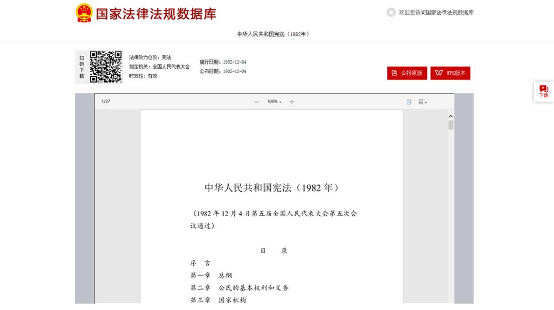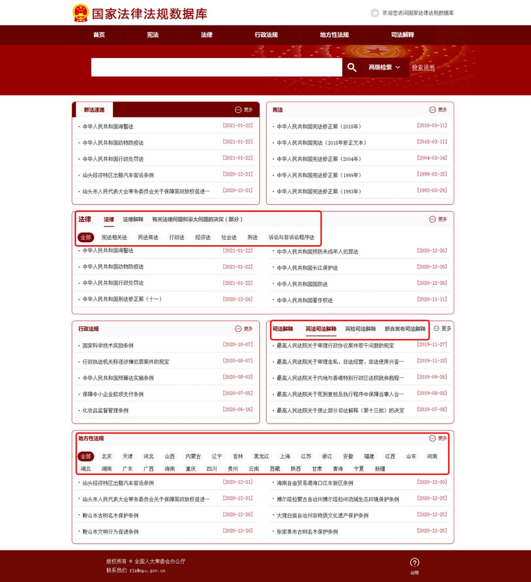 国家法律法规数据库(https://flk.npc.gov.cn/)由全国人大建立并维护,目前登载中华人民共和国的宪法、法律、行政法规、地方性法规以及司法解释。(网站首页参考图1.1)