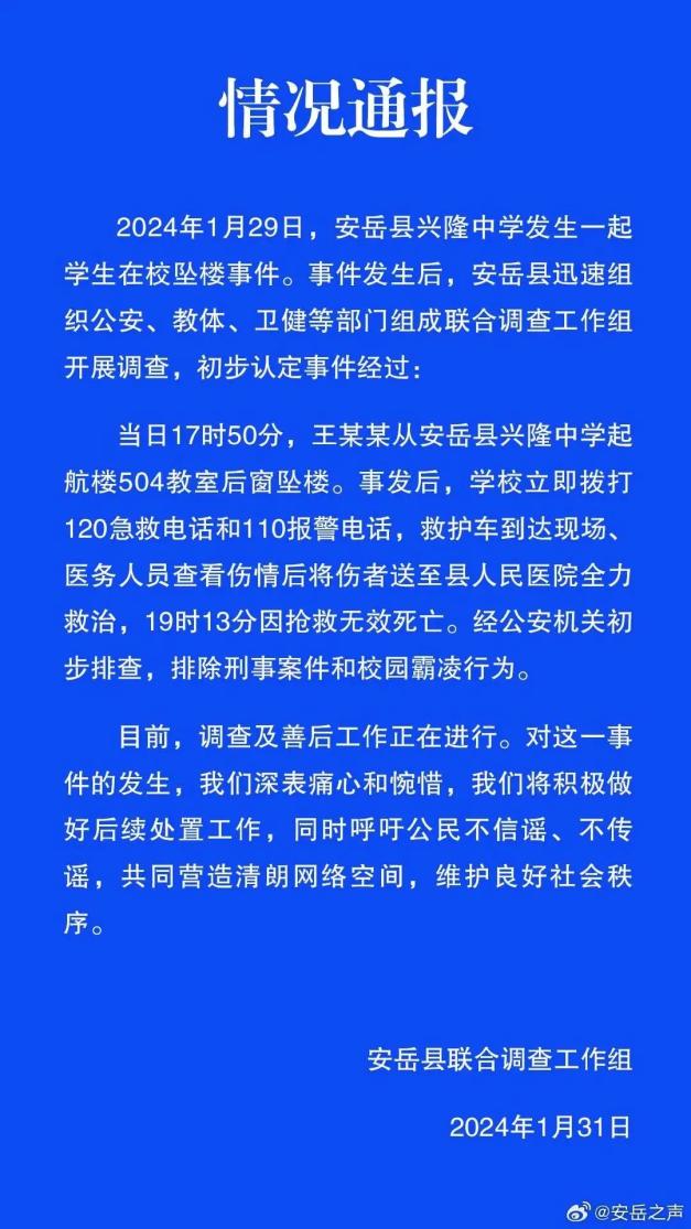 9.四川一学生被老师逼得跳楼身亡?警方通报:1月29日,四川省资阳市安岳县兴隆中学发生一起学生在校坠楼事件。事发后,安岳县迅速组成联合调查工作组开展调查,初步认定事件经过:当日17时50分,王某某从学校起航楼504教室后窗坠楼。事发后,学校立即拨打120和110,救护车到达现场、医务人员查看伤情后将伤者送医全力救治,19时13分因抢救无效死亡。经公安机关初步排查,排除刑事案件和校园霸凌行为。此前有网友发布消息称,兴隆中学有学生被老师故意逼得跳楼身亡。(观察者网)