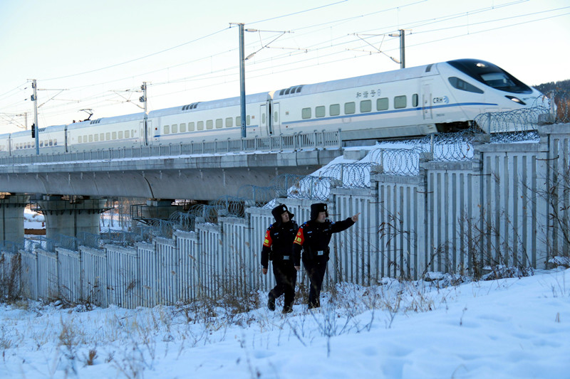 1月20日,哈尔滨铁路公安局牡丹江铁路公安处海林北站派出所民警正在开展线路隐患排查。 梅华英杰 摄