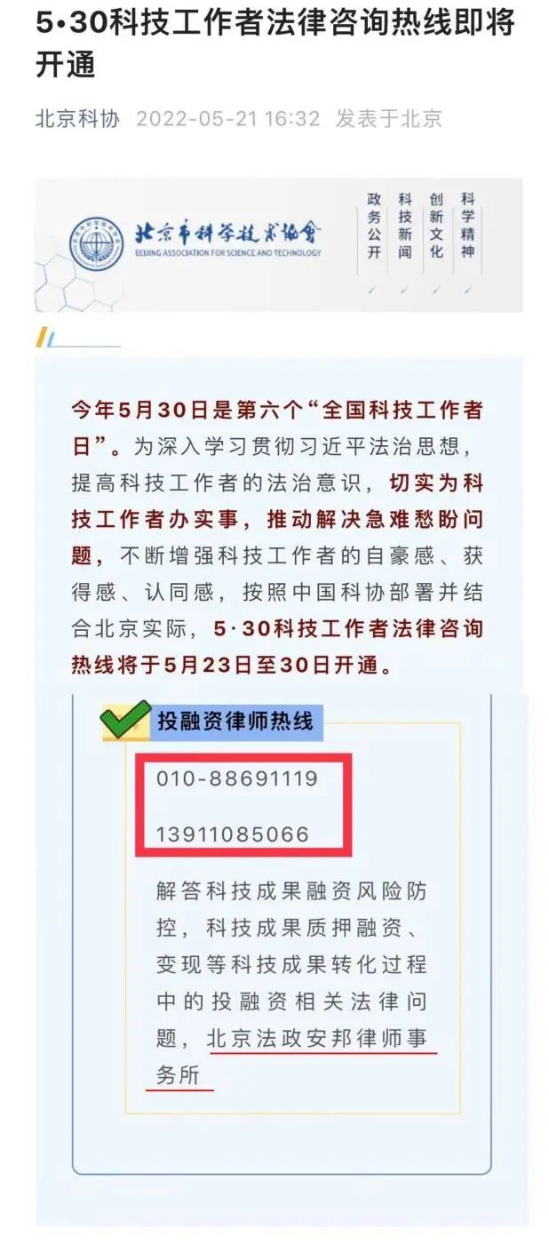 北京法政安邦律师事务所作为北京市科学技术协会的法律顾问单位,积极响应落实“5·30科技工作者法律咨询热线”活动,于5月23日-30日开通“投融资律师热线”,安排专业律师值班,为广大科技工作者们解答科技成果融资风险防控,科技成果质押融资、变现等科技成果转化过程中的投融资相关法律问题。(刘云雷)