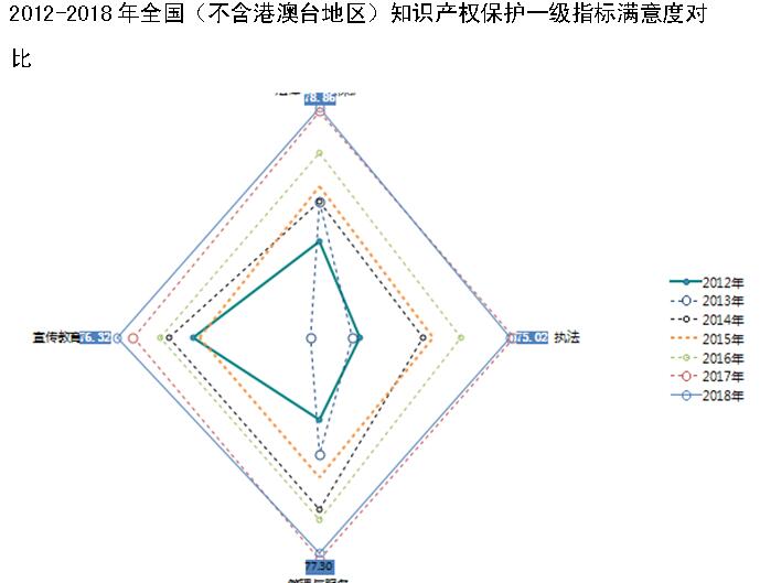 2018年,法律与政策保护满意度最高,且社会公众满意度大幅提升也主要得益于对法律与政策保护满意度的大幅提升。这在一定程度上反应了在专利法、商标法等法律法规的修改过程中,广泛征求社会公众意见,开门立法既全面收集了各方面的意见建议,也普及宣传了相关知识,提升了公众的知识产权法律意识。
