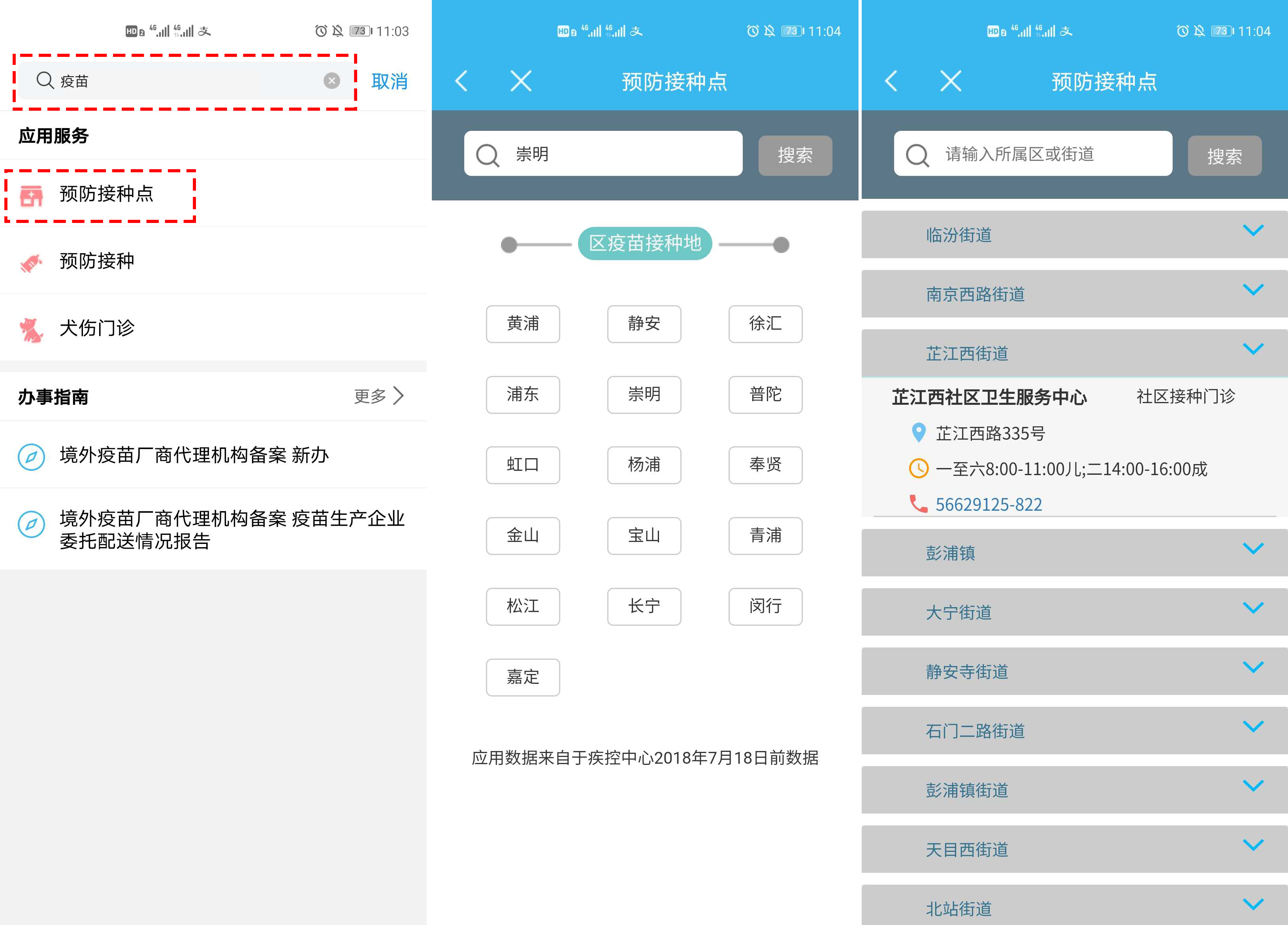 点击后“预防接种点”,即可自行通过点击“区域”,找到该区中所有疫苗接种点的地址、办公时间和联系电话等信息。