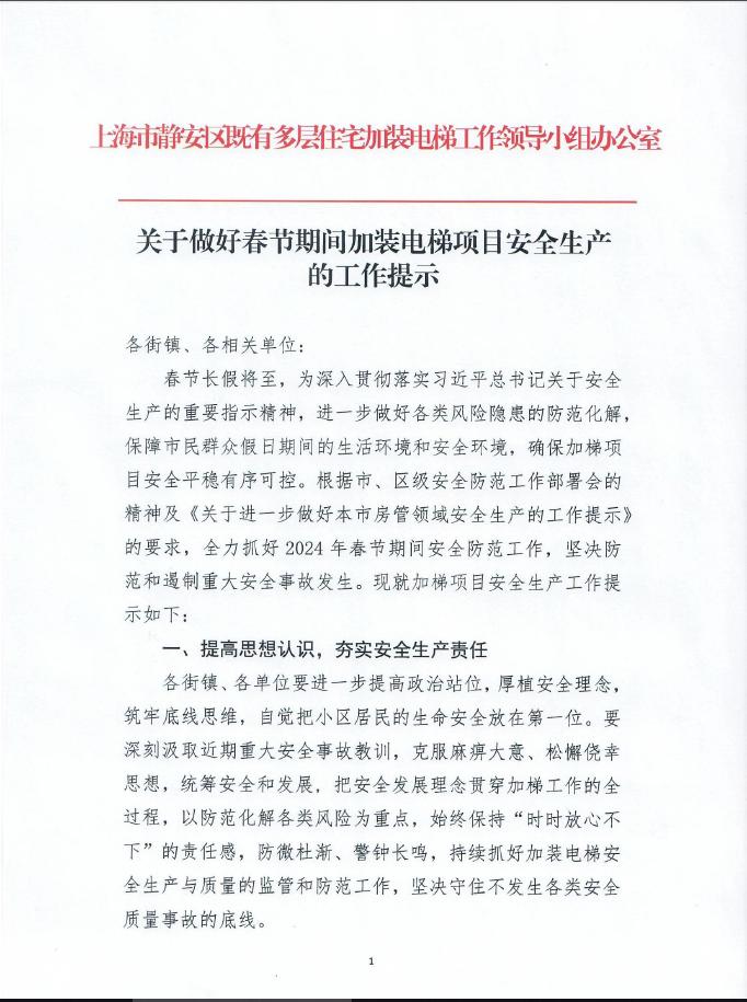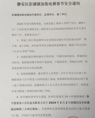 为深刻汲取近期重大安全事故教训,确保春节长假期间加装电梯项目安全可控,力争把风险隐患消除在萌芽状态,根据市、区级安全防范工作部署会及《关于进一步做好本市房管领域安全生产的工作提示》等文件的精神,静安区房管局(区加梯办)进一步压紧压实安全责任,部署抓好本区加装电梯春节前后安全生产工作,印发了《关于做好春节期间加装电梯项目安全生产的工作提示》,坚决防范遏制重特大事故,确保小区居民生命财产安全与正常生活。