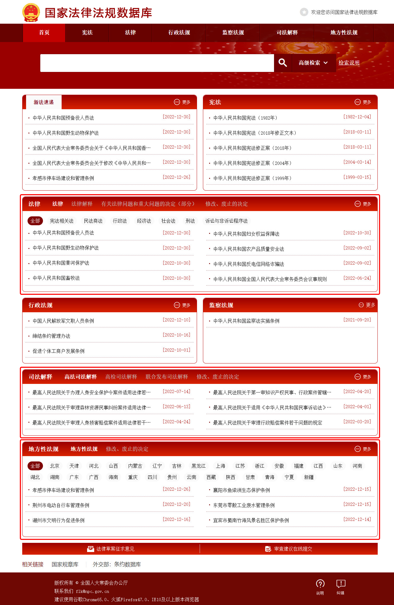首页窗口内容分为“新法速递”,“宪法”,“法律”,“行政法规”,“监察法规”,“地方性法规”,“司法解释”七个部分,其中“新法速递”,“宪法”,“行政法规”,“监察法规”可直接查看相对应的法律法规(参考图2.1),“法律”,“司法解释”,“地方性法规”有下级分类,可以通过点击切换查看相对应的法律法规。(参考图2.2)
