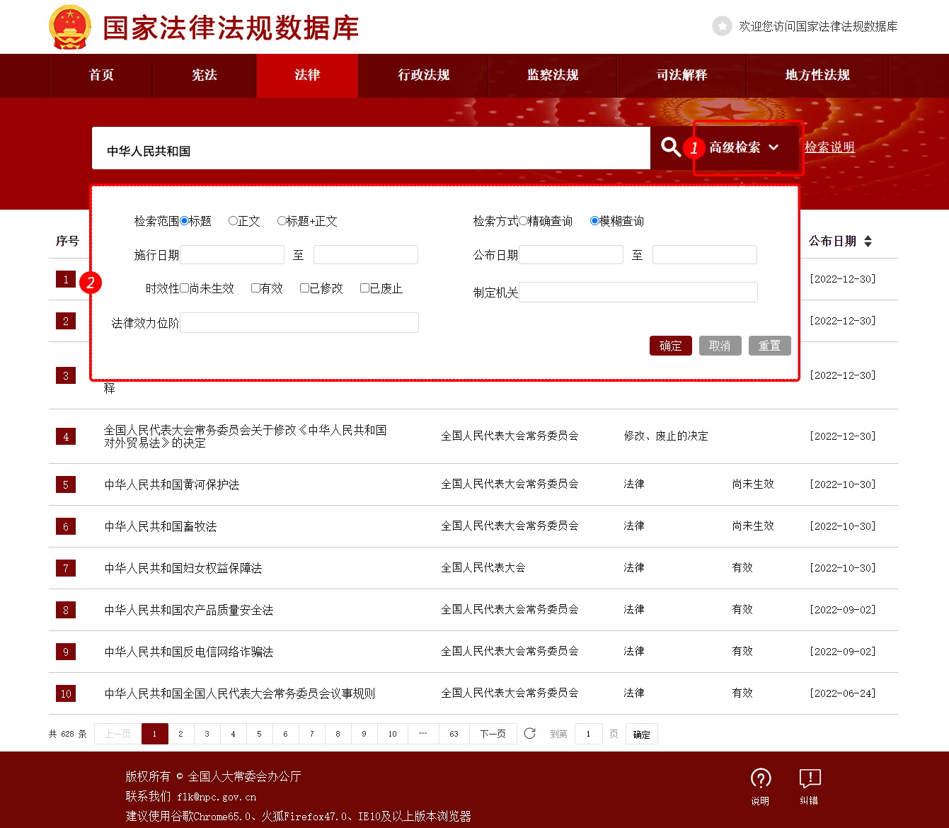 用户还可以通过高级搜索来进行更加精确的查询。点击高级搜索,下方出现弹框:可以通过勾选弹框中的选项来进行精确的筛选(施行日期、公布日期、时效性、制定机关、法律效力位阶),弹框中三个按钮的分别是确定,取消,重置。确定按钮的作用是确定筛选条件并进行搜索,取消按钮的作用是取消筛选条件并关闭筛选菜单,重置按钮的作用是取消筛选条件不关闭筛选菜单。(参考图2.7)