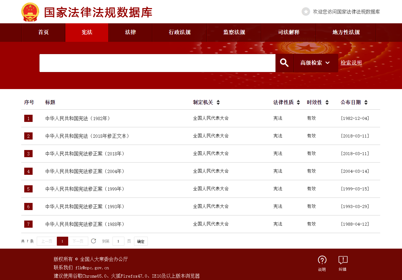 点击“首页”,在“宪法、法律、行政法规、监察法规、地方性法规、司法解释”中任意一个点击“更多”按钮(以宪法为例),跳转到对应栏目,并展示相应详细数据列表。(参考图2.3,2.4)