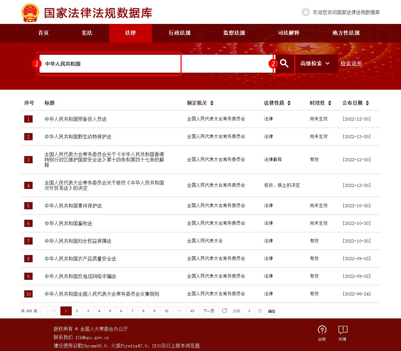 点击不同法律种类的按钮(以法律为例),可以查询相应的法律法规,相应的法律法规则会通过列表的形式展示,序号、标题、制定机关、法律性质、时效性以及公布日期。(参考图2.5)