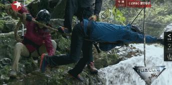 “趴下来,两只手抓麻绳。我跟贝尔都抓着你,所以你不会掉下去。把左脚放开,感受平衡。呼吸,专注……”