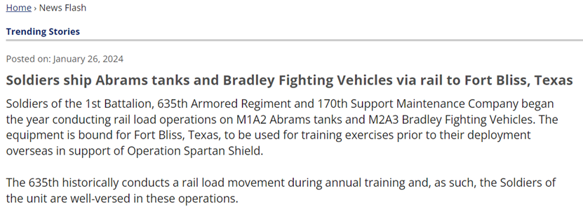 从2017年起,堪萨斯国民警卫队开始大力参与支持“斯巴达盾牌行动”。上述堪萨斯政府网站发布的公告中提到:“635部队历来在年度训练中负责铁路装载行动,该部队的士兵对这些行动非常熟悉。”查阅堪萨斯州政府此前发布的公告信息,可以发现635装甲团在2023年6月也曾执行过类似的铁路运输任务,且目的地同为得克萨斯州的布利斯堡。
