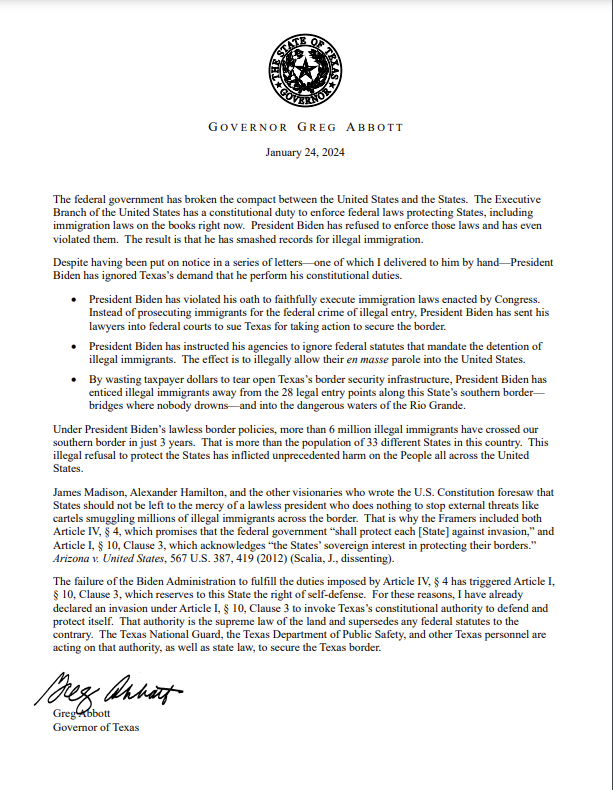 声明中,阿博特提到:“(美国)制宪者们在宪法第四条第4款和第一条第10款第3项中均承诺,联邦政府‘应保护各州免受入侵’,并承认‘各州在保护其边界方面的主权利益(sovereign interest)’。拜登政府未能履行第四条第4款所规定的职责,这触发了第一条第10款第3条,该条款为本州保留了自卫权。基于这些原因,我已经根据《宪法》第一条第10 款第3项宣布被入侵,以援引得克萨斯州的宪法权利进行自卫和保护。这一权利是这片土地上的最高法律,超越任何与之相反的联邦法规。得克萨斯州国民警卫队、得克萨斯州公共安全部和其他得克萨斯州人员正在根据这一权利和州法律采取行动,以确保得克萨斯州边境的安全。”