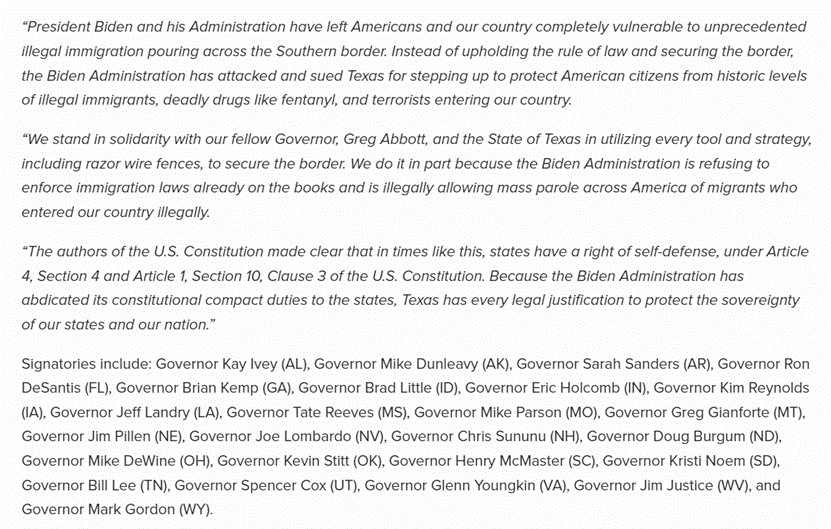 25名美国共和党州长发布的联合声明内文截图。