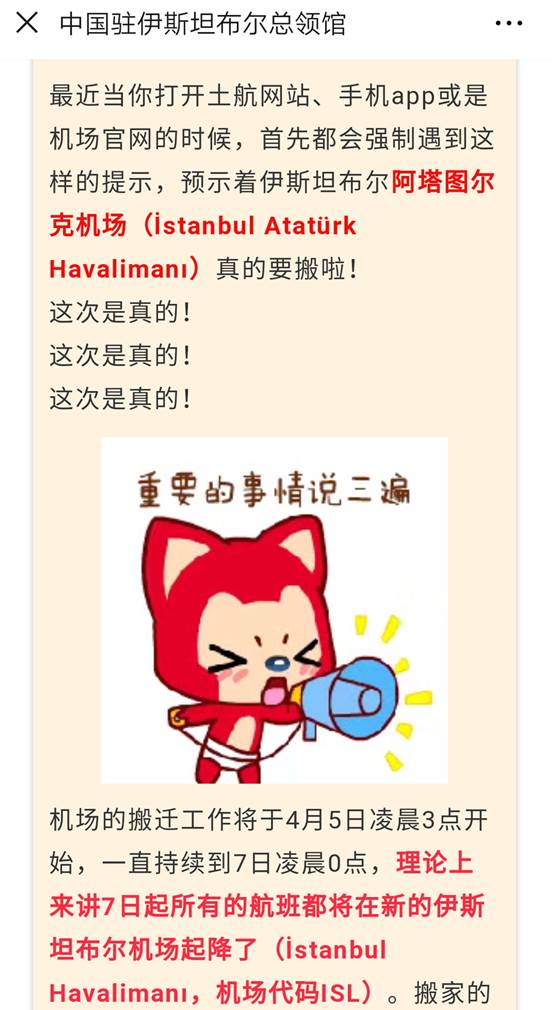 据中国驻土耳其伊斯坦布尔总领馆微信公众号消息,近日,伊斯坦布尔阿塔图尔克机场将搬迁。对此,总领馆提醒中国公民,若有计划在搬迁期间往来伊斯坦布尔欧洲区机场,请一定要注意动态查询自己的航班信息。此外,新机场、新路线,请一定留出充足的时间。