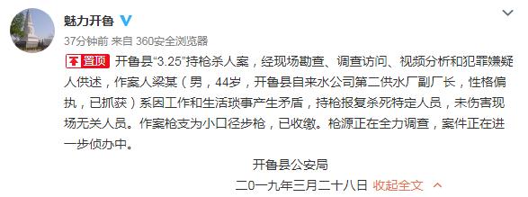 据开鲁县委宣传部微博消息,内蒙古开鲁县持枪杀人案作案人梁某(男,44岁,开鲁县自来水公司第二供水厂副厂长,性格偏执,已抓获)系因工作和生活琐事产生矛盾,持枪报复杀死特定人员,未伤害现场无关人员。作案枪支为小口径步枪,已收缴。枪源正在全力调查,案件正在进一步侦办中。