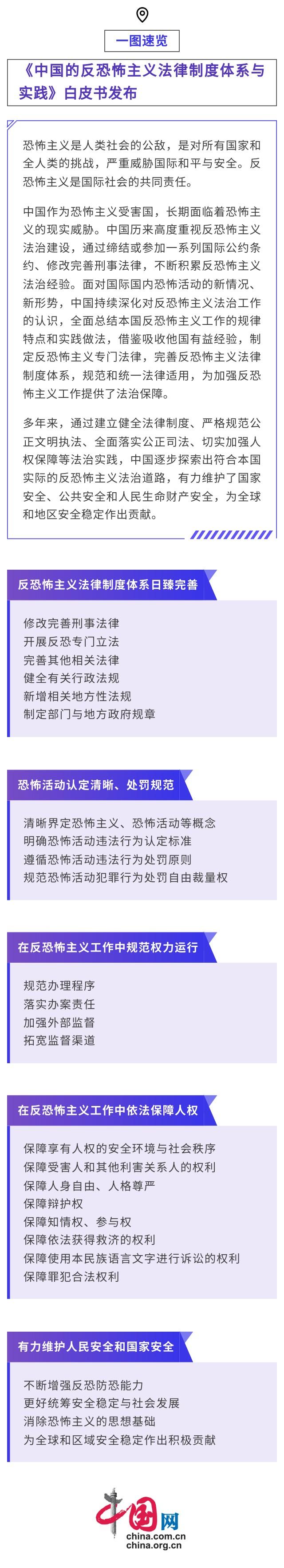 1月23日,国务院新闻办公室发布《中国的反恐怖主义法律制度体系与实践》白皮书。白皮书除前言、结束语外分为五个部分,分别是反恐怖主义法律制度体系日臻完善,恐怖活动认定清晰、处罚规范,在反恐怖主义工作中规范权力运行,在反恐怖主义工作中依法保障人权,有力维护人民安全和国家安全。