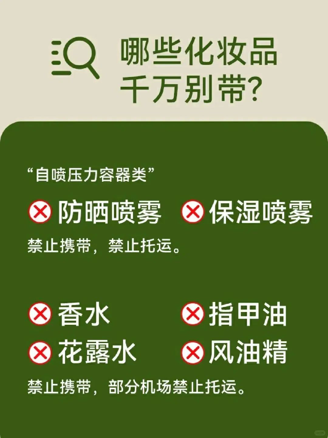 带有有害成分的化妆品,如指甲油、染发剂、除臭剂、驱蚊水等,可能会对飞机和其他乘客造成安全威胁,禁止携带。