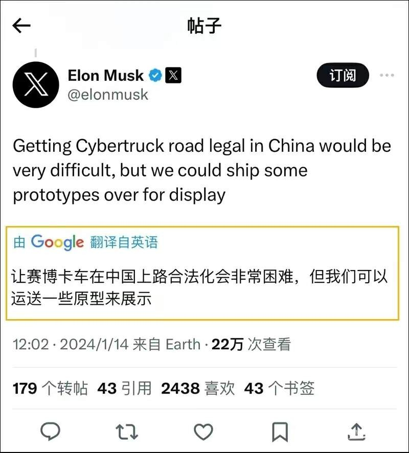 尽管特斯拉Cybertruck在中国市场的展出引起了很大的关注度,但马斯克并未有在华上市的计划。不久前,马斯克在X上含蓄表示,“Cybertruck在中国上路合法化会非常困难,目前仅有送原型车展示环节,无法驾驶体验。”这则消息基本验证了大部分人此前的判断。