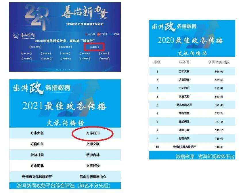 “方志四川”澎湃号2020年获“澎湃新闻·文旅传播榜”第三名,2021年获“优秀澎湃政务号”,入围“2022年度传播案例”。“方志四川”川观号获评2020年度优质政务类“川观号”。