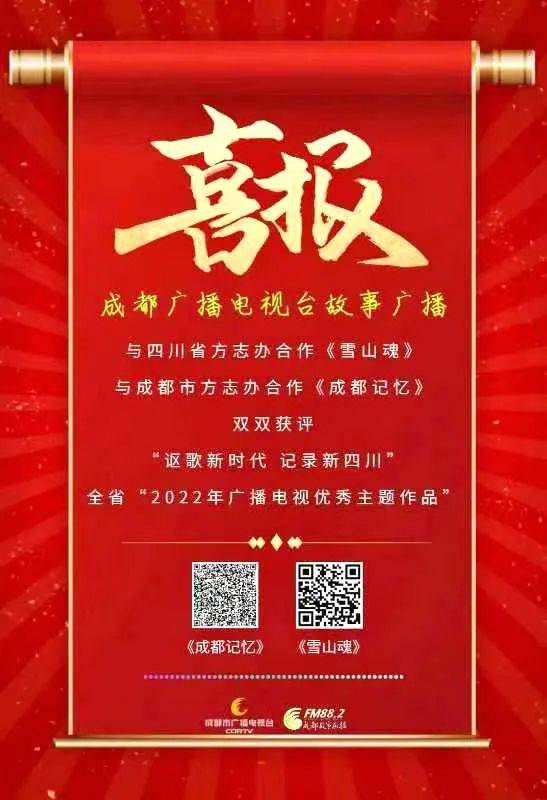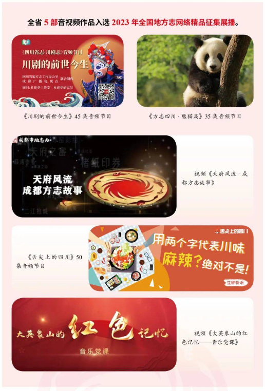 传播立体化。 转变志书传统平面传播模式,推动方志文化可听、可视传播,制作一系列活色“声”香、画面精美、内容丰富的音、视频节目,深受各界好评。省地方志办依托独具特色、群众喜爱的川菜、川酒、川剧、大熊猫等“川字号”特色志书,联合成都广播电视台、喜马拉雅官方电台等制作《舌尖上的四川》《方志四川·熊猫篇》《四川方言的来龙去脉》《川剧的前世今生》《雪山魂》等音频节目800余期,在成都广播电台、喜马拉雅官方电台、腾讯音乐平台等媒体播出。其中,《舌尖上的四川》被评为全国政务专辑人气类前十名;《雪山魂》获评四川省“2022年广播电视优秀主题作品”;《舌尖上的四川》《方志四川·熊猫篇》《川剧的前世今生》入选2023年全国地方志网络精品征集展播活动名单。