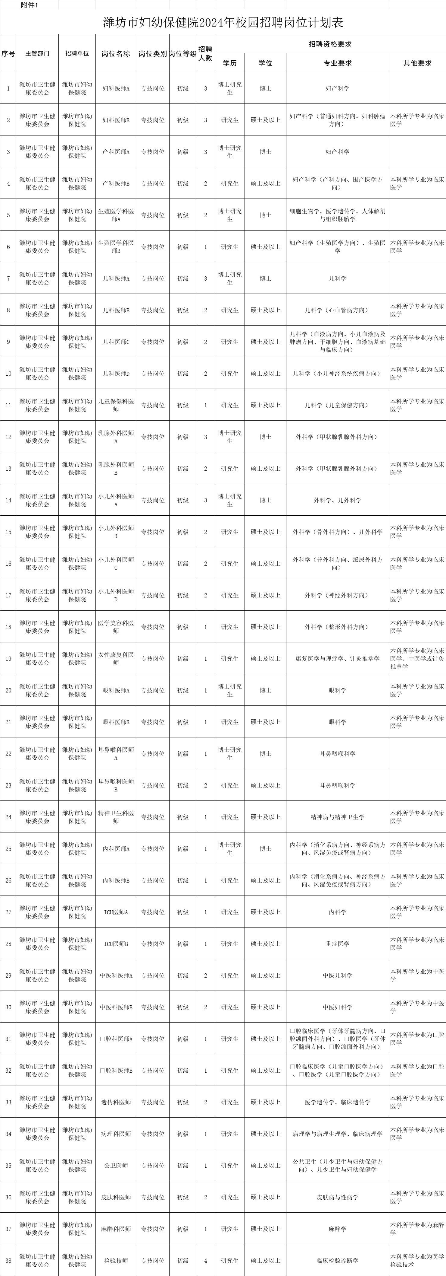 附件:1.潍坊市妇幼保健院2024年校园招聘岗位计划表