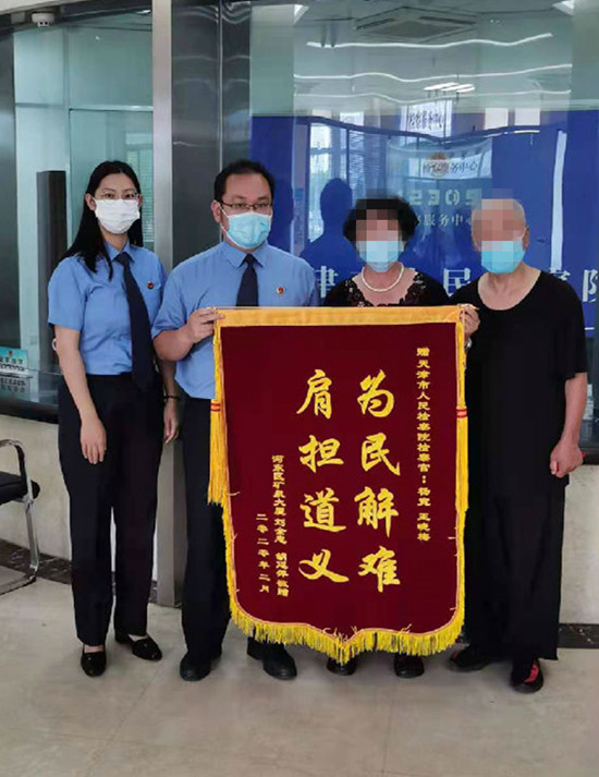 2019年12月,天津市检察院就此案向天津市高级法院提出抗诉,天津市高级法院指令中级法院再审该案。胡大娘夫妇闻讯后为表示感谢,来到天津市检察院将定制的锦旗送给办案检察官。