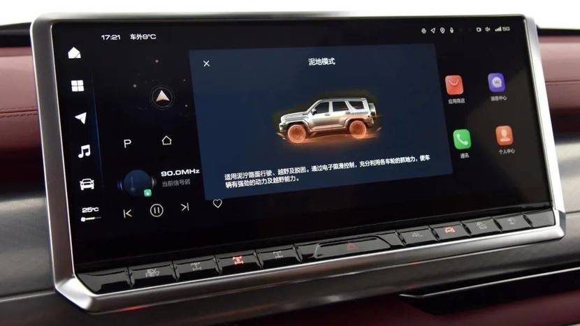 车辆的核心功能都集成在中控屏附近,除了屏幕内部搭载的智能车机系统外,在屏幕下方还设计了一排横向排布的实体按键,这里可以控制车辆的EV/HEV动力模式、前中后差速锁、低速四驱、坦克调头、陡坡缓降等功能。值得一提的是,三把锁和坦克调头等功能是全系标配的。