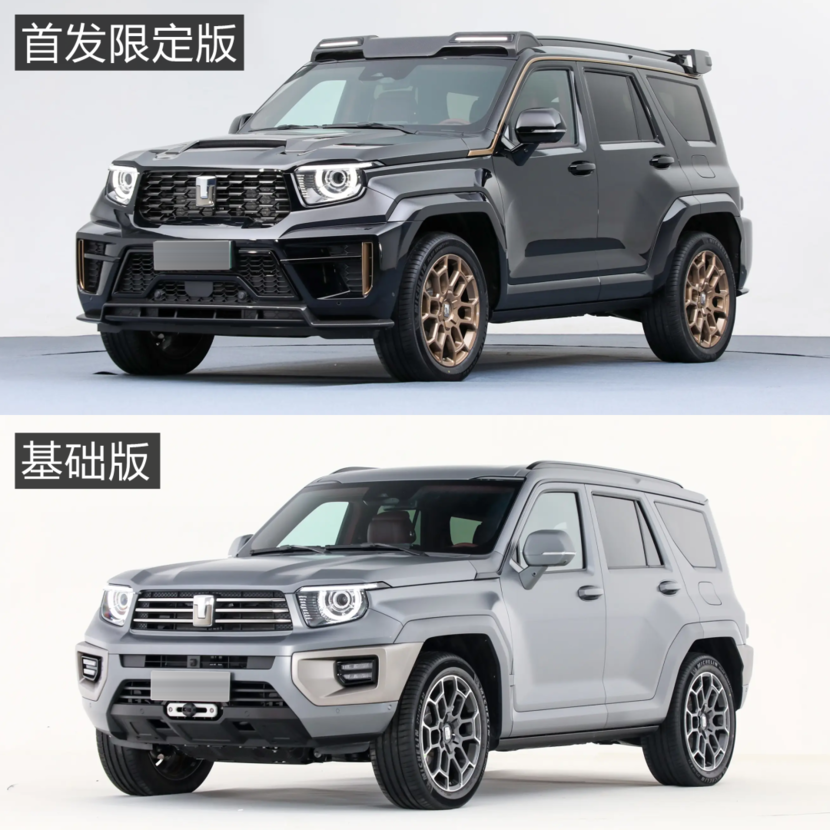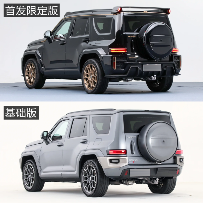 在车尾部分,基础版车型去掉了夸张的尾翼以及下方的扩散器,后杠的造型也进行了调整,但是中间硕大的后挂式备胎还在。另外,参与预售的用户,还能免费赠送价值1.5万元的牵引套装,包括电动拖车钩、2500kg拖车资质、拖车供电接口、以及电动绞盘。