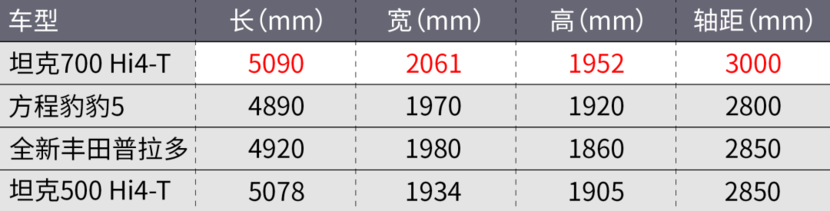 尺寸方面,其实坦克700的车长并不是特别夸张,仅比坦克500多了12mm。但是车辆的宽度达到了2061mm,高度也有1952mm,轴距长达3000mm,这样的身材放在4、50万价位里已经是非常夸张的存在了。