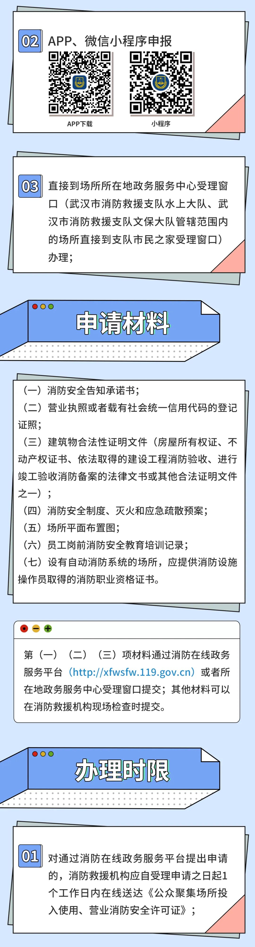 (三)属于消防救援机构职权范围,申请材料齐全、符合法定形式的,应予以受理并出具受理凭证。对通过消防在线政务服务平台提出申请的,消防救援机构应自收到申请之日起1个工作日内在线送达《公众聚集场所投入使用、营业消防安全许可证》;对到窗口提出申请的,消防救援机构应当场直接送达《公众聚集场所投入使用、营业消防安全许可证》。