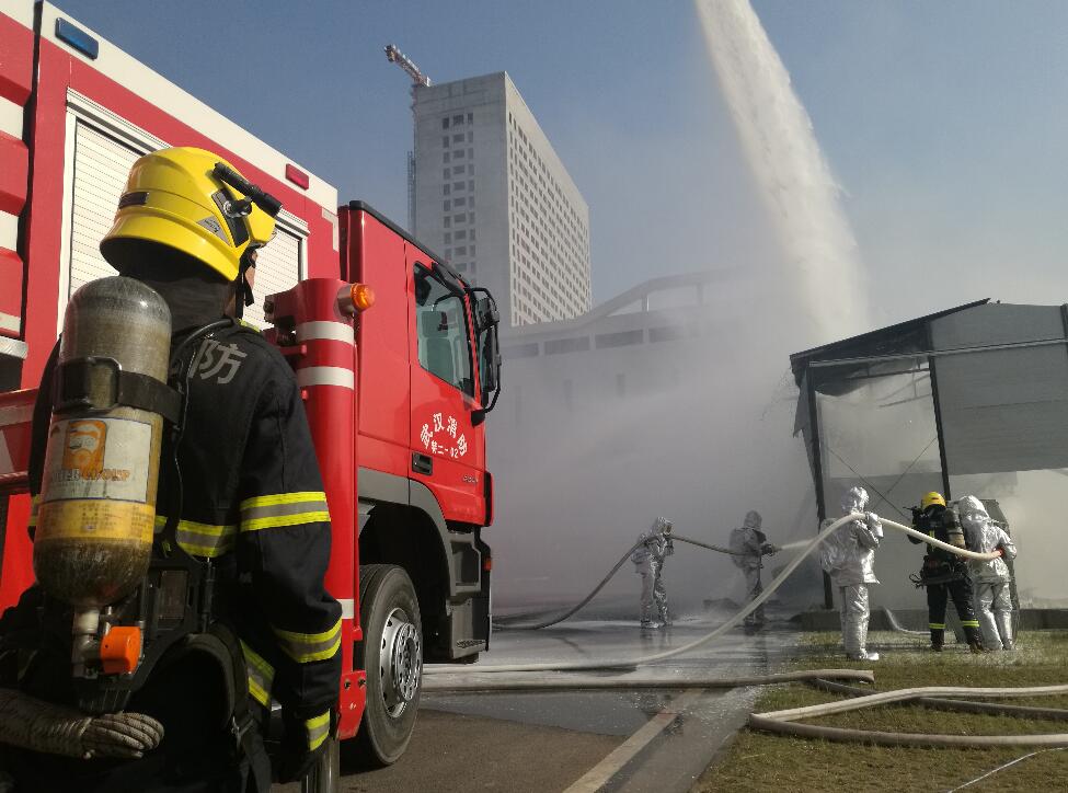 今天活动的现场模拟了一场大型危化品仓库火灾扑救行动。随着一声模拟爆炸声响起,危化品模拟仓库燃起熊熊大火。武汉消防三个消防中队组成危化品攻坚组赶赴现场进行处置。包括1辆核生化侦检消防车、2辆高喷消防车、2辆城市主战消防车、4辆重型泡沫水罐消防车和2辆灭火机器人、1辆侦察机器人等12辆特种消防车辆及装备一齐上阵,组成强大灭火阵容,将现场大火成功扑灭。
