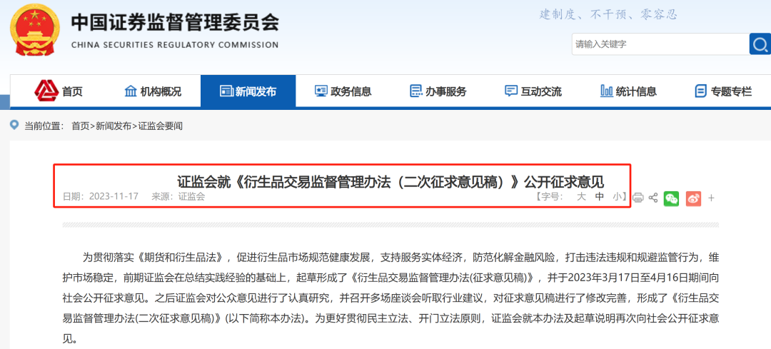 11月17日晚间,中国证监会在官网发布公告,就《衍生品交易监督管理办法(二次征求意见稿)》(简称《办法》)公开征求意见,促进衍生品市场规范健康发展,支持服务实体经济,防范化解金融风险,打击违法违规和规避监管行为,维护市场稳定。
