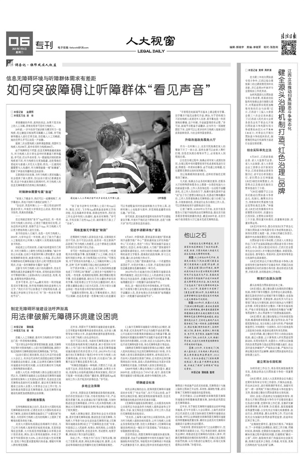 持续关注就业、医疗、教育、养老等民生领域话题,关注老年人、残疾人、妇女儿童权益保护,用心用情用力帮助人民群众解决困难事、烦心事。开设“调查记·保障残疾人权益”专栏,调查残疾人生活现状,呼吁依法保障残疾人权益;刊发《开学季,课后服务如何成为最优解》《未成年人网游这条生意链怎么断》等数十篇稿件,助力“双减”政策落地;《法治日报·社区版》专门设立“青少年与法”专版,搭建法治工作者、教师、学生与社会的沟通交流平台。