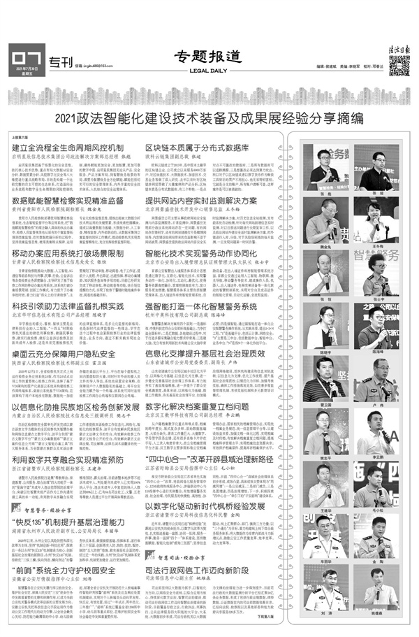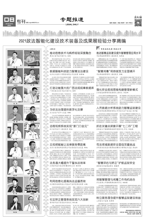 2021年7月30日,《法治日报》5至8版推出《2021政法智能化建设技术装备及成果展经验分享摘编》(点击图片查看)