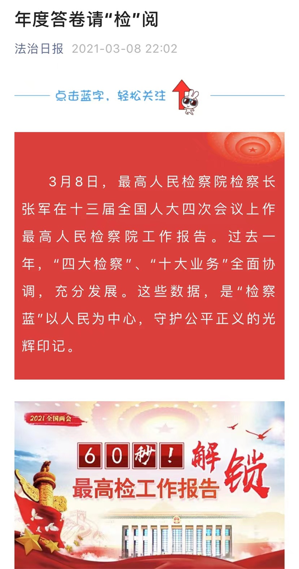 2021年3月8日,法治日报微信公众号推出图解《年度答卷请“检”阅》《年度大考有说“法”》,生动、直观展示“两高”一年工作成绩(点击图片查看)