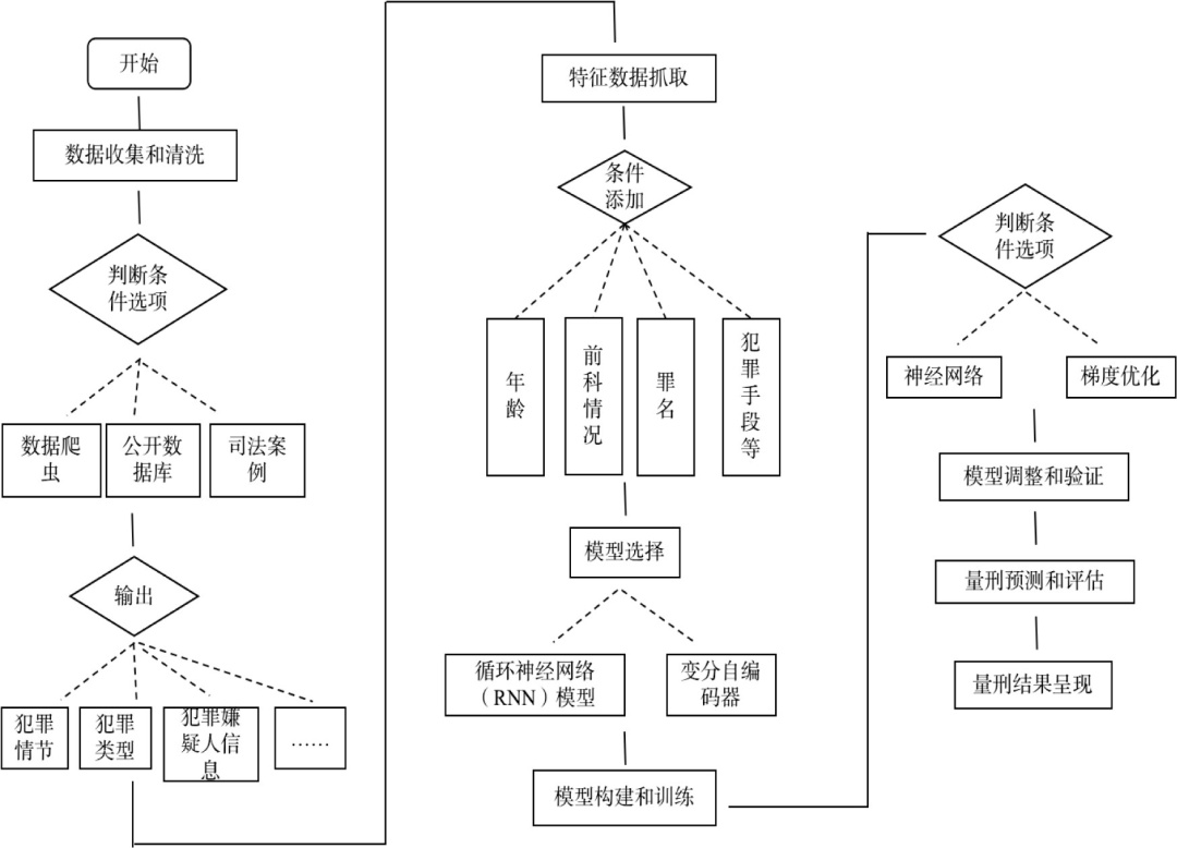 在当下的实际办案中,仍然需要归纳出焦点问题并进行全面分析,最终做出案件的定性、量刑。生成式人工智能基于自然语言处理、机器学习和人工智能等技术原理,可以重点围绕智能审查(采用人工智能技术校核文书会更加高效和客观,自动审查法律文本和修改指示,确保文书质量)、量刑预测、笔录生成等业务场域,通过语义分析技术识别出犯罪情节,智能推荐相似罪名、相似情节案例;智能匹配相关法律法规、司法解释;依据犯罪事实和情节计算量刑区间,智能推送类案量刑结果,提出量刑建议等智能化技术,辅助办案人员的常规工作,减轻工作负担,提升工作效率。以量刑预测的自动化应用场域展开:技术原理:首先,通过自然语言处理技术和语料库,将案件中的事实和证据进行分析和归纳,提取出案件中的关键词和主题。然后,基于机器学习算法,对已有的法律文书、量刑指南等相关文本进行训练和学习,并建立量刑模型。其次,将生成式人工智能引入辅助量刑领域。生成式人工智能采用深度学习、神经网络等技术,根据案件事实和证据,自动生成量刑建议,同时进行风险评估、刑期预测和偏倚分析等工作。具体流程(见图1):(1)数据收集和清洗:需要大量的数据输入,可以通过数据爬虫、公开数据库、司法案例等途径获取收集相关案例的数据(包括犯罪类型、犯罪情节、犯罪嫌疑人信息等),并对数据进行清洗,保证数据的可靠性和准确性。(2)特征数据抓取:根据数据分析的需求,选取与量刑相关的特征数据,例如被告人的年龄、前科情况、罪名、犯罪次数、犯罪动机、犯罪手段等。(3)模型选择:选择合适的生成式人工智能模型进行构建,比如基于循环神经网络(RNN)模型或者变分自编码器。(4)模型构建和训练:使用深度学习技术,例如神经网络,对数据进行处理和训练模型,生成可以预测量刑的模型。使用清洗后的数据进行模型训练,通过梯度优化算法进行迭代训练。(5)模型调整和验证:训练完成后需要对模型进行调整和验证,在测试集上进行验证和评估模型的准确率和效果。(6)量刑预测和评估:根据犯罪嫌疑人的信息和犯罪情节,使用预测模型进行量刑预测,输出预测结果,对生成的预测结果进行评估和验证,检查模型的准确性和稳定性。(7)量刑建议结果呈现:将预测结果与司法人员对案情的判断和证据进行比对,生成司法人员可以参考的量刑建议结果。