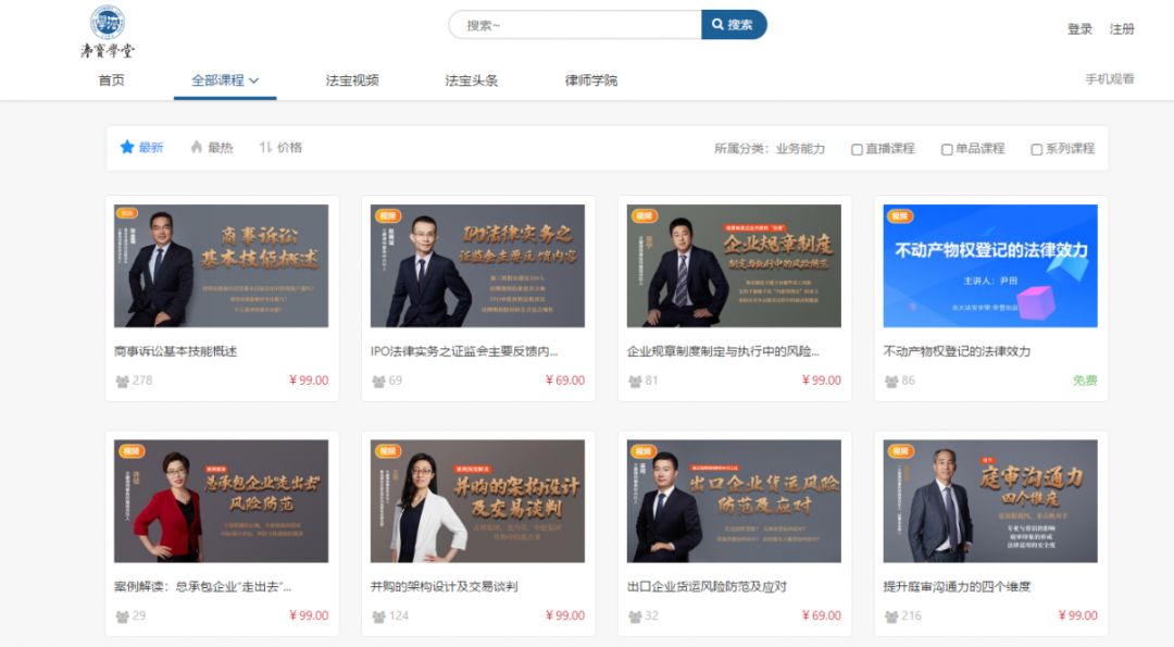 (3)北大法宝的“法宝学堂”版块——利用了北大的师资,收录了不少法律授课视频。但是这个版块是单独收费的,价格不低,免费资源很少,有些律师讲的课件,有一定实务价值。