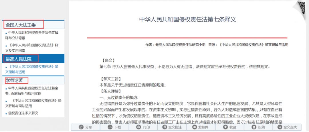 (2)法条释义功能——法信把全国人大法工委对法律条文的立法释义、最高法院的对法律条文的理解适用还有权威专家学者的理论著述,都按照拆解到具体条文和法条超链在一起,可以对照使用,但是这个功能藏的比较深,有时会注意不到。